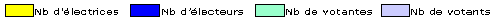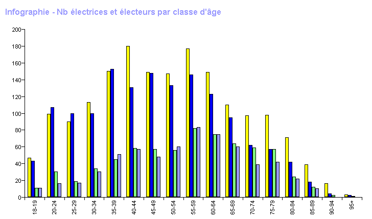 | | | | | | | | | | | | | | | | | | | | | | | | | | | | | | | Femmes | | | | Hommes | | | | Total | | | | | Classes d'âge | Nb électrices | Nb votes | % part. | % votes | Nb électeurs | Nb votes | % part. | % votes | Nb total électeurs | Nb total votes | % total part. | % total votes | | 18-19 | 47 | 11 | 23.40 | 1.60 | 43 | 11 | 25.58 | 1.77 | 90 | 22 | 24.44 | 1.68 | | 20-24 | 99 | 30 | 30.30 | 4.37 | 107 | 16 | 14.95 | 2.58 | 206 | 46 | 22.33 | 3.52 | | 25-29 | 90 | 19 | 21.11 | 2.77 | 100 | 17 | 17.00 | 2.74 | 190 | 36 | 18.95 | 2.75 | | 30-34 | 113 | 34 | 30.09 | 4.96 | 100 | 30 | 30.00 | 4.83 | 213 | 64 | 30.05 | 4.90 | | 35-39 | 150 | 45 | 30.00 | 6.56 | 153 | 51 | 33.33 | 8.21 | 303 | 96 | 31.68 | 7.35 | | 40-44 | 180 | 58 | 32.22 | 8.45 | 131 | 57 | 43.51 | 9.18 | 311 | 115 | 36.98 | 8.80 | | 45-49 | 149 | 57 | 38.26 | 8.31 | 148 | 48 | 32.43 | 7.73 | 297 | 105 | 35.35 | 8.03 | | 50-54 | 147 | 56 | 38.10 | 8.16 | 133 | 60 | 45.11 | 9.66 | 280 | 116 | 41.43 | 8.88 | | 55-59 | 177 | 82 | 46.33 | 11.95 | 146 | 83 | 56.85 | 13.37 | 323 | 165 | 51.08 | 12.62 | | 60-64 | 149 | 75 | 50.34 | 10.93 | 123 | 75 | 60.98 | 12.08 | 272 | 150 | 55.15 | 11.48 | | 65-69 | 110 | 64 | 58.18 | 9.33 | 95 | 60 | 63.16 | 9.66 | 205 | 124 | 60.49 | 9.49 | | 70-74 | 97 | 59 | 60.82 | 8.60 | 62 | 39 | 62.90 | 6.28 | 159 | 98 | 61.64 | 7.50 | | 75-79 | 98 | 57 | 58.16 | 8.31 | 57 | 42 | 73.68 | 6.76 | 155 | 99 | 63.87 | 7.57 | | 80-84 | 71 | 24 | 33.80 | 3.50 | 42 | 22 | 52.38 | 3.54 | 113 | 46 | 40.71 | 3.52 | | 85-89 | 39 | 12 | 30.77 | 1.75 | 18 | 10 | 55.56 | 1.61 | 57 | 22 | 38.60 | 1.68 | | 90-94 | 16 | 2 | 12.50 | 0.29 | 4 | | | | 20 | 2 | 10.00 | 0.15 | | 95+ | 3 | 1 | 33.33 | 0.15 | 2 | | | | 5 | 1 | 20.00 | 0.08 | | Totaux | 1'735 | 686 | 39.54 | | 1'464 | 621 | 42.42 | | 3'199 | 1'307 | 40.86 | |