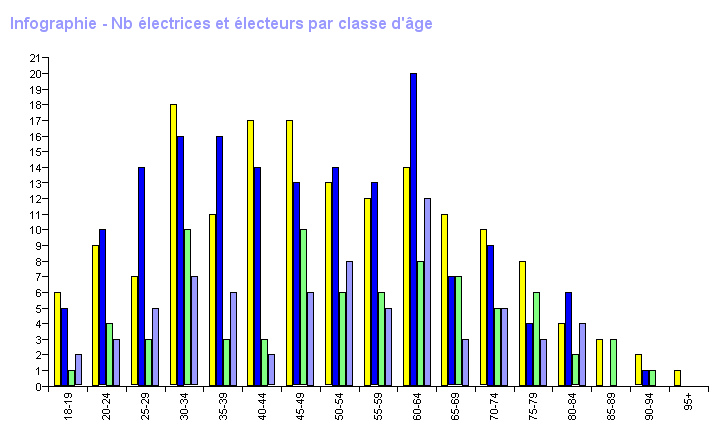 | | | | | | | | | | | | | | | | | | | | | | | | | | | | | | | Femmes | | | | Hommes | | | | Total | | | | | Classes d'âge | Nb électrices | Nb votes | % part. | % votes | Nb électeurs | Nb votes | % part. | % votes | Nb total électeurs | Nb total votes | % total part. | % total votes | | 18-19 | 6 | 1 | 16,67 | 1,28 | 5 | 2 | 40,00 | 2,82 | 11 | 3 | 27,27 | 2,01 | | 20-24 | 9 | 4 | 44,44 | 5,13 | 10 | 3 | 30,00 | 4,23 | 19 | 7 | 36,84 | 4,70 | | 25-29 | 7 | 3 | 42,86 | 3,85 | 14 | 5 | 35,71 | 7,04 | 21 | 8 | 38,10 | 5,37 | | 30-34 | 18 | 10 | 55,56 | 12,82 | 16 | 7 | 43,75 | 9,86 | 34 | 17 | 50,00 | 11,41 | | 35-39 | 11 | 3 | 27,27 | 3,85 | 16 | 6 | 37,50 | 8,45 | 27 | 9 | 33,33 | 6,04 | | 40-44 | 17 | 3 | 17,65 | 3,85 | 14 | 2 | 14,29 | 2,82 | 31 | 5 | 16,13 | 3,36 | | 45-49 | 17 | 10 | 58,82 | 12,82 | 13 | 6 | 46,15 | 8,45 | 30 | 16 | 53,33 | 10,74 | | 50-54 | 13 | 6 | 46,15 | 7,69 | 14 | 8 | 57,14 | 11,27 | 27 | 14 | 51,85 | 9,40 | | 55-59 | 12 | 6 | 50,00 | 7,69 | 13 | 5 | 38,46 | 7,04 | 25 | 11 | 44,00 | 7,38 | | 60-64 | 14 | 8 | 57,14 | 10,26 | 20 | 12 | 60,00 | 16,90 | 34 | 20 | 58,82 | 13,42 | | 65-69 | 11 | 7 | 63,64 | 8,97 | 7 | 3 | 42,86 | 4,23 | 18 | 10 | 55,56 | 6,71 | | 70-74 | 10 | 5 | 50,00 | 6,41 | 9 | 5 | 55,56 | 7,04 | 19 | 10 | 52,63 | 6,71 | | 75-79 | 8 | 6 | 75,00 | 7,69 | 4 | 3 | 75,00 | 4,23 | 12 | 9 | 75,00 | 6,04 | | 80-84 | 4 | 2 | 50,00 | 2,56 | 6 | 4 | 66,67 | 5,63 | 10 | 6 | 60,00 | 4,03 | | 85-89 | 3 | 3 | 100,00 | 3,85 | | | | | 3 | 3 | 100,00 | 2,01 | | 90-94 | 2 | 1 | 50,00 | 1,28 | 1 | | | | 3 | 1 | 33,33 | 0,67 | | 95+ | 1 | | | | | | | | 1 | | | | | Totaux | 163 | 78 | 47,85 | | 162 | 71 | 43,83 | | 325 | 149 | 45,85 | |